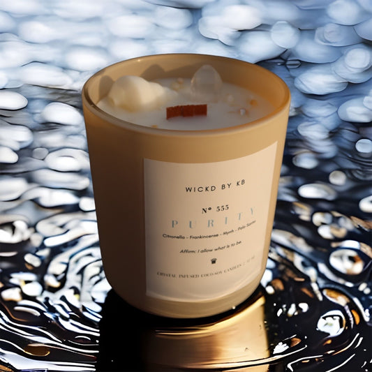 Each candle is crystal infused, saged and blessed with loving intentions.